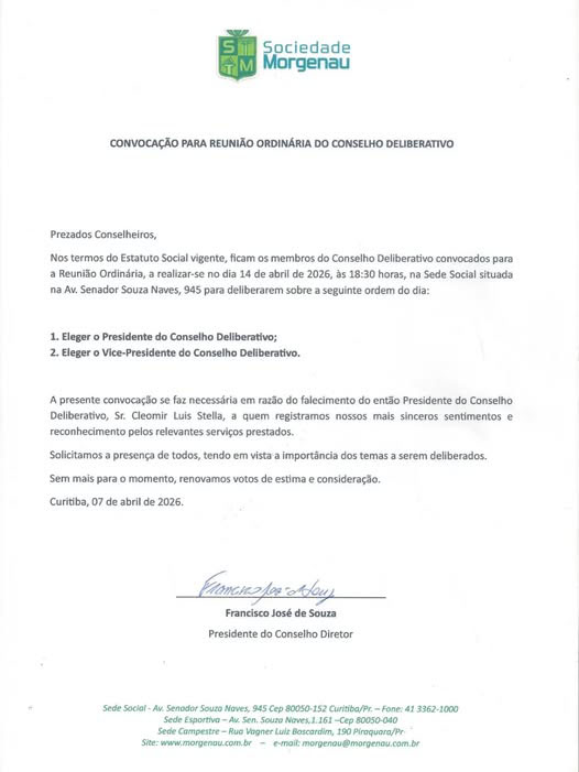 Nos termos do Estatuto Social vigente, ficam os membros do Conselho Deliberativo convocados para a Reunião Ordinária, a realizar-se no dia 14 de abril de 2026, às 18:30 horas, na Sede Social situada na Av. Senador Souza Naves, 945 para deliberarem sobre a seguinte ordem do dia: